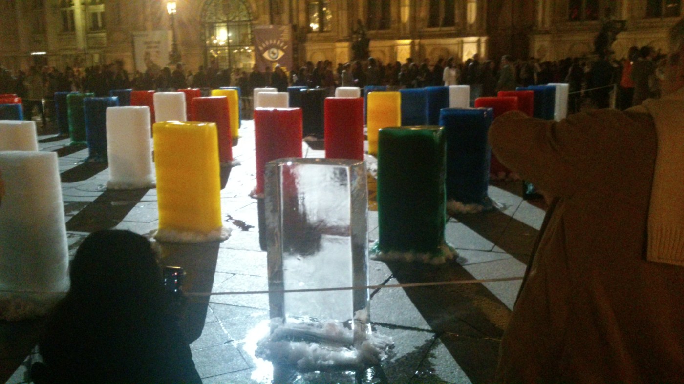 Comme Le Parisien, nous avons été un peu déçus. Mais qu’à cela ne tienne, nous avons tout de même décidé de vous livrer quelques réactions captées autour de l’œuvre de l’artiste chinois Zhenchen Liu : 270 blocs de glace colorés installé au crépuscule et qui fondre tout au long de la nuit. Peu à peu, les couleurs des blocs se mêlent pour former un immense tableau abstrait. (PIX : M. Mirepoix/2015)
